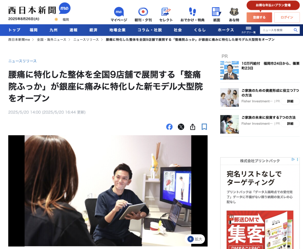 2016年8月、福岡・赤坂に開業し、現在全国に9院を展開(2025年3月現在)。運動療法を用い独自開発した「MSMメソッド®」で、どこへ行っても改善されなかった腰痛、坐骨神経痛を中心とする慢性的な体の痛みや悩みを根本から改善します。これまで5000人以上を施術してきた整体師が在籍し、寄り添った丁寧なカウンセリングと、豊富な知識/経験に基づいた的確な施術にリピーターの方も多くいらっしゃいます。2023年6月には『株式会社ふっか』として法人化し、店舗拡大を続けています。